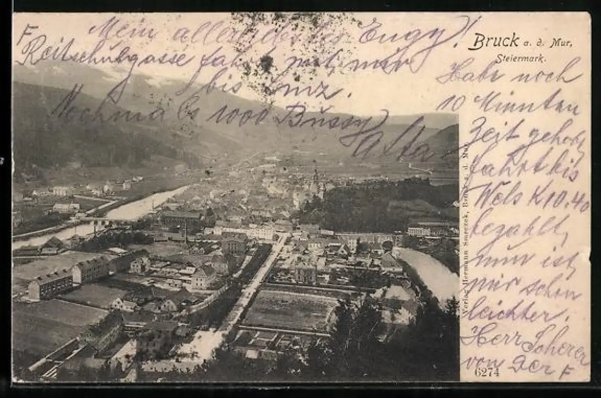 AK Bruck a. d. Mur, Totalansicht vom Berg aus