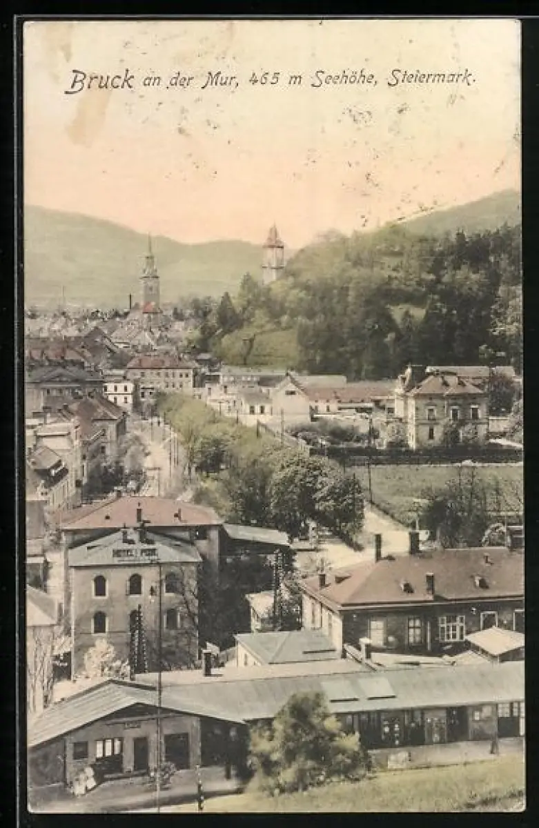 AK Bruck an der Mur, Bahnhof mit Ortsansicht