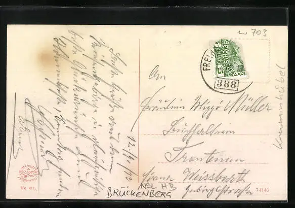 Personenbezogene Daten auf der Rückseite der Karte wurden durch blauen Textmarker unkenntlich gemacht. Die blauen Stellen sind auf die Vorderseite durchgeweicht und wirken sich negativ auf das Postkartenfoto aus