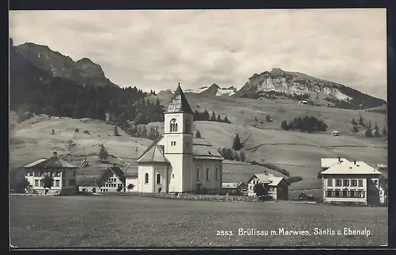 AK Brülisau, Teilansicht mit Kirche, Marwies, Säntis und Ebenalp