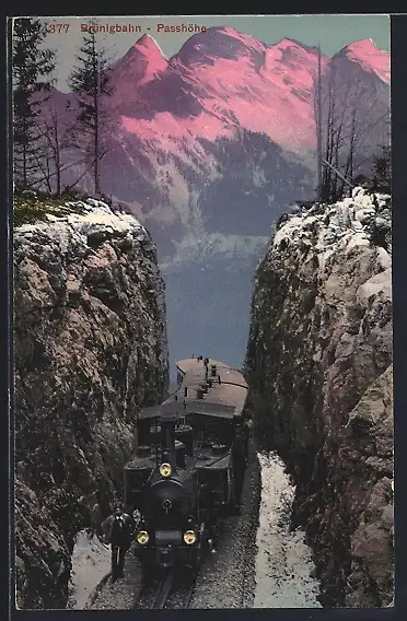 AK Brünig-Bergbahn auf der Passhöhe im Abendrot