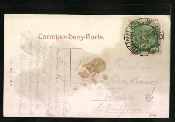 alte Ansichtskarte, gelaufen 1910, Eckknick oben li., rückseitig Oberflächenschaden, guter Zustand