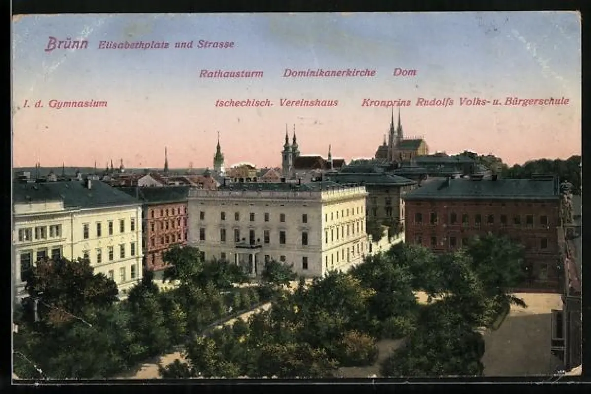 AK Brünn / Brno, Elisabethplatz und Strasse, Rathausturm, Dominikanerkirche, Dom, Gymnasium, tschch. Vereinshaus