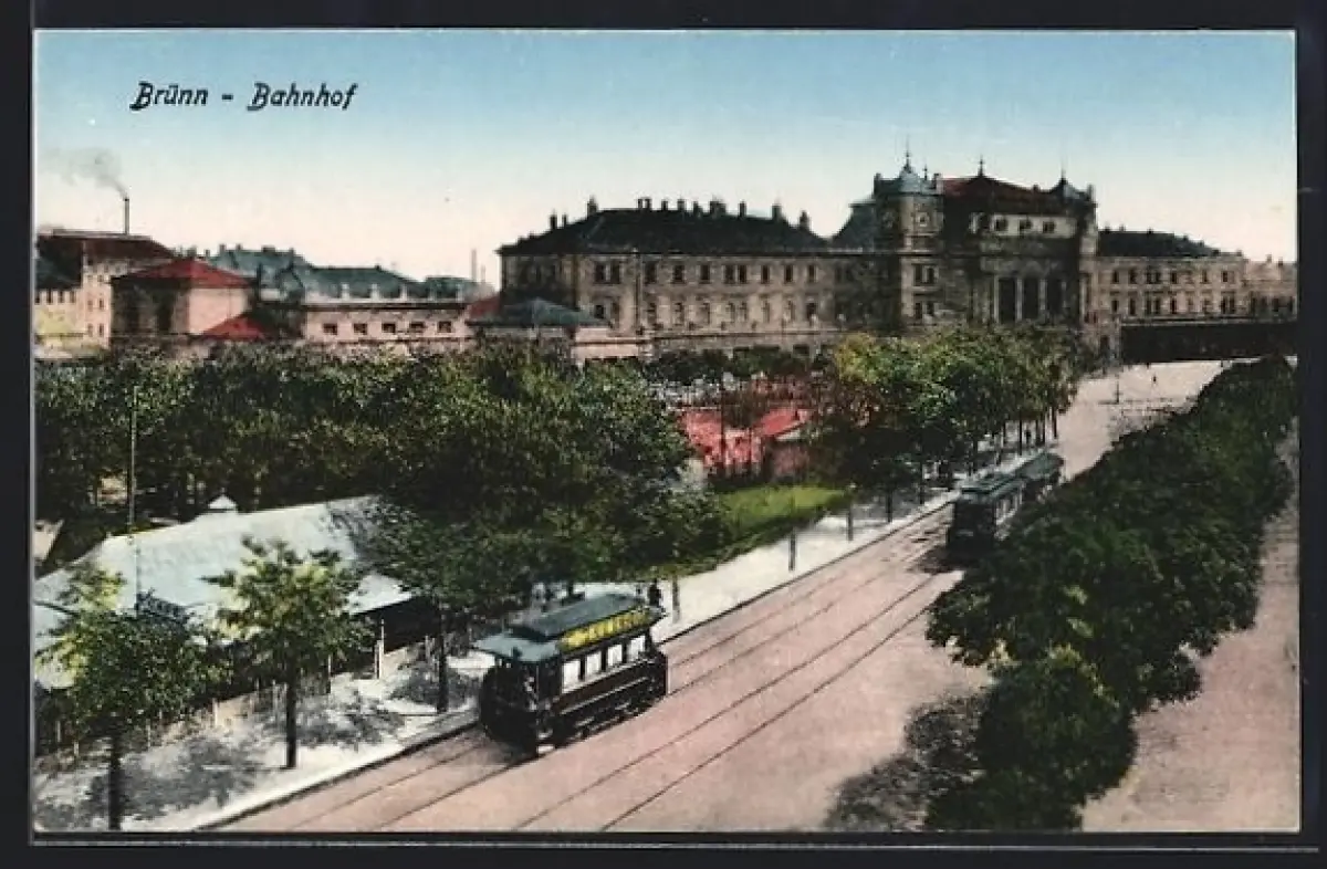 AK Brünn / Brno, Nádrazí, Blick zum Bahnhof, Strassenbahn