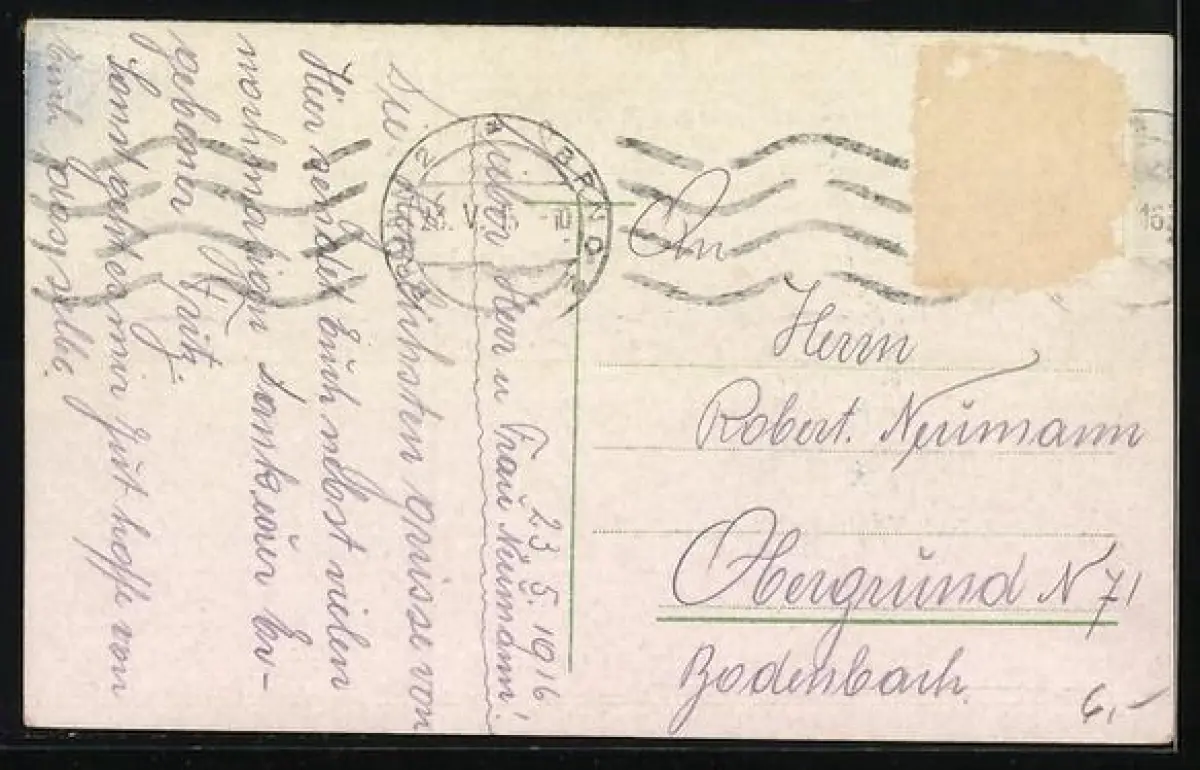 gelaufen 1916, Briefmarke entfernt, rückseitig Oberflächenschaden, guter Zustand