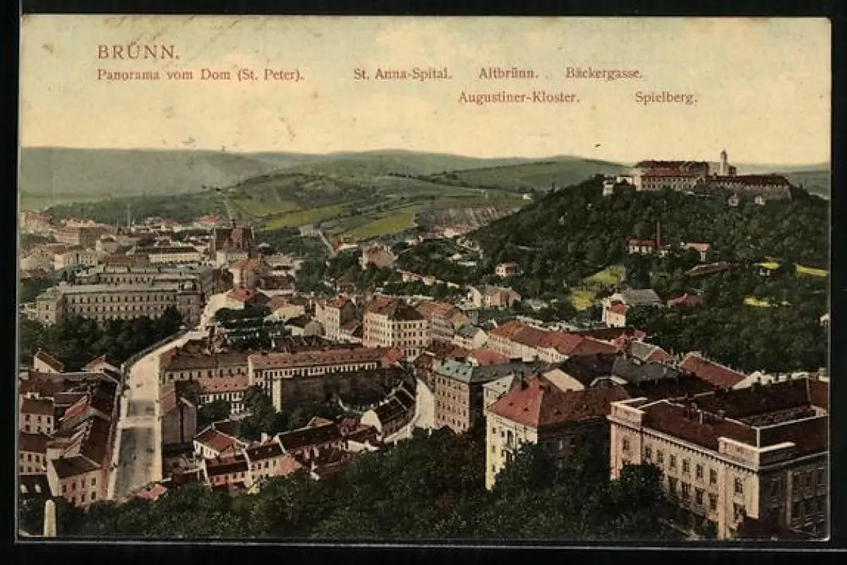 AK Brünn, Panorama vom Dom St. Peter, St. Anna-Spital, Augustiner-Kloster und Altbrünn
