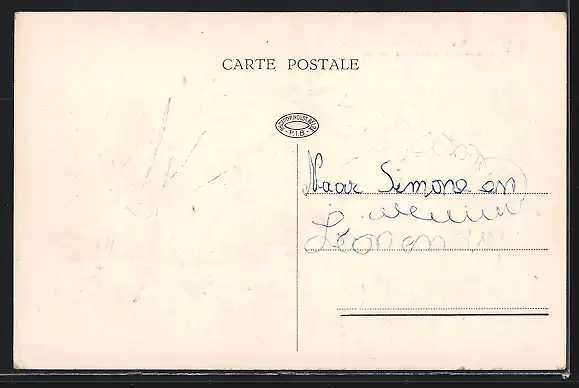 Personenbezogene Daten auf der Rückseite der Karte wurden durch blauen Textmarker unkenntlich gemacht. Die blauen Stellen sind auf die Vorderseite durchgeweicht und wirken sich negativ auf das Postkartenfoto aus