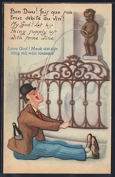 AK Brüssel, Mann sitzt unter dem Mannekin Pis und hofft auf Wein