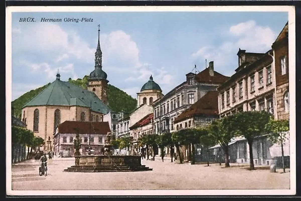 AK Brüx, Hermann Göring-Platz mit Kirche