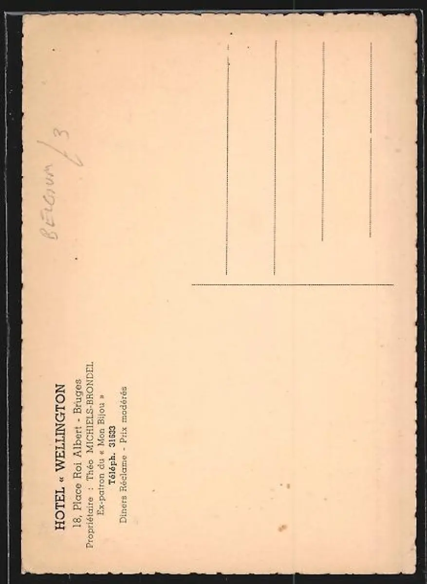 AK Bruges, Hotel Wellington, 18 Place Roi Albert, Propr. Théo Michiels-Brondel