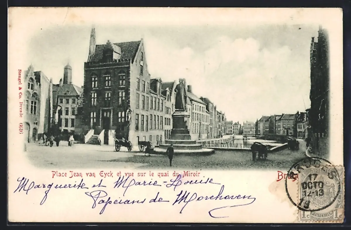 AK Bruges, Place Jean van Eyck et vue sur le quai du Miroir