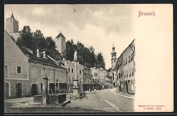 AK Bruneck, Strassenpartie mit Brunnen und Denkmal