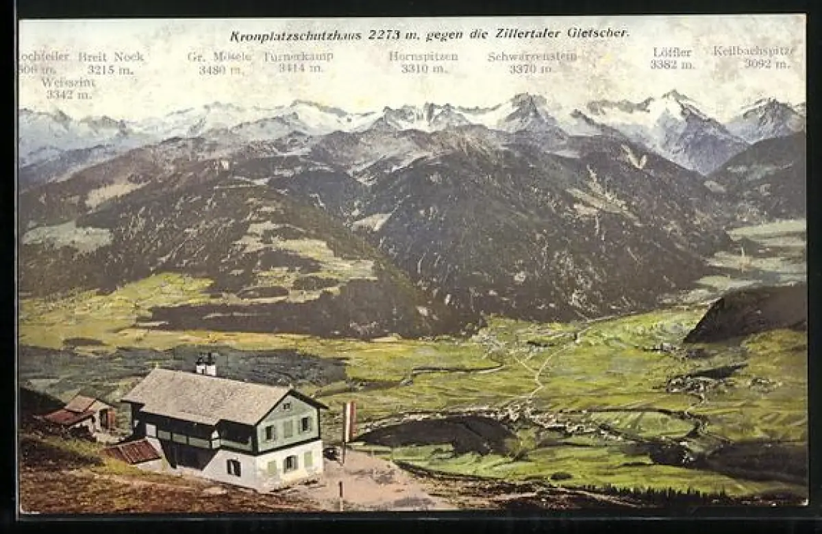 AK Brunecker-Haus / Kronplatzschutzhaus, Gesamtansicht mit Zillertaler Gletscher