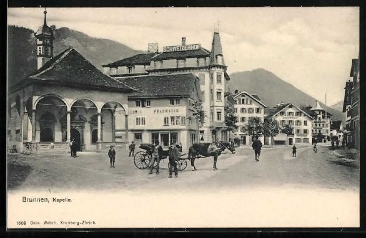 AK Brunnen, Hotel Schweizerhof, Kapelle und Apotheke
