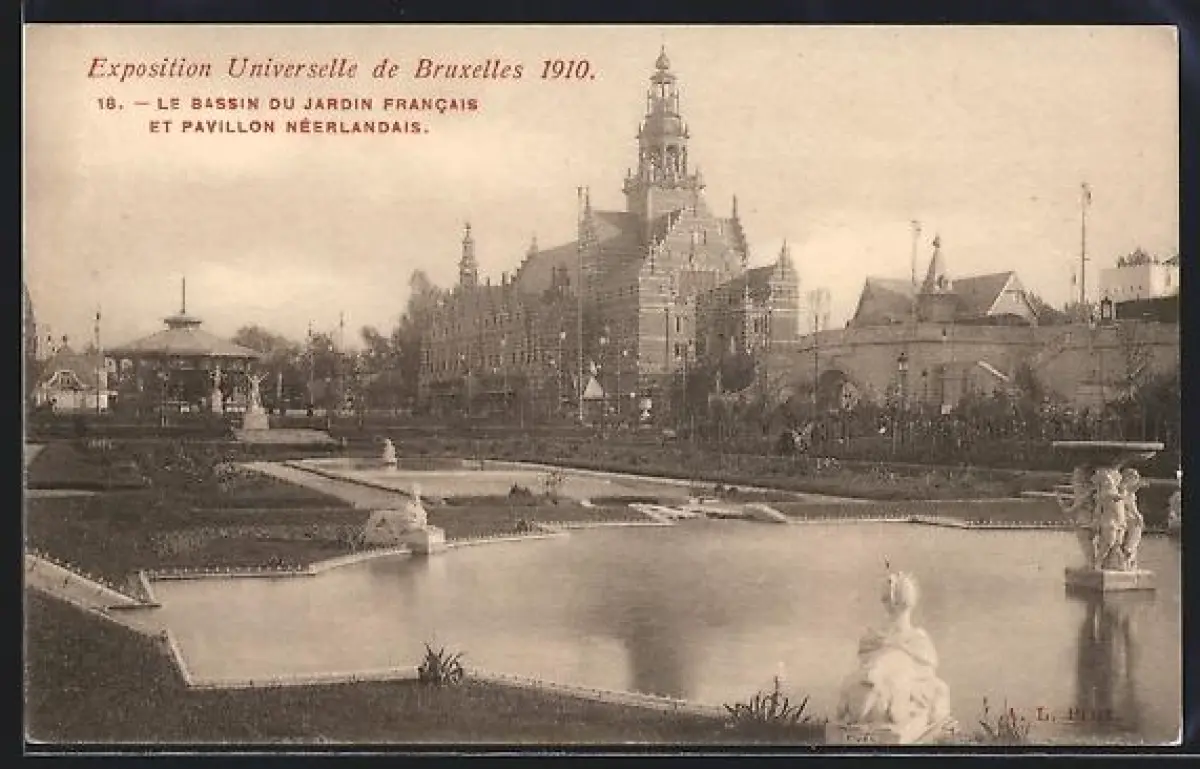 AK Bruxelles, Exposition Universelle 1910, Le Bassin du Jardin Francais et Pavillon Néerlandais