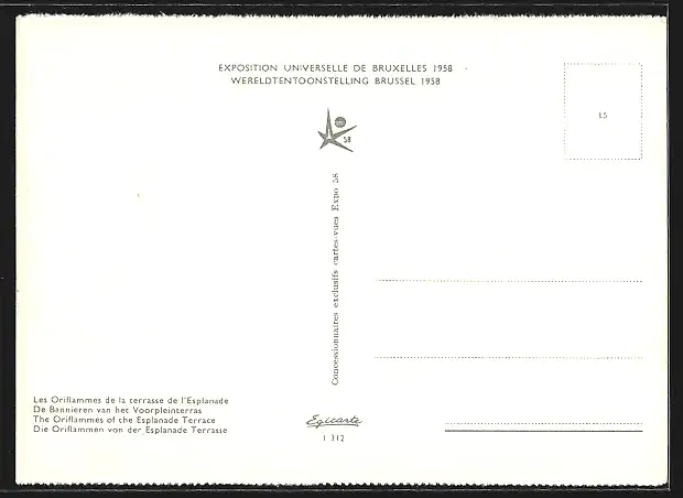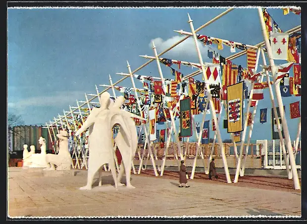 AK Bruxelles, Exposition Universelle 1958, Les Oriflammes de la terrasse de l`Esplanade