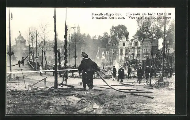 AK Bruxelles, Exposition, l'Incendie des 14-15 Aout 1910, vue vers le grand portique
