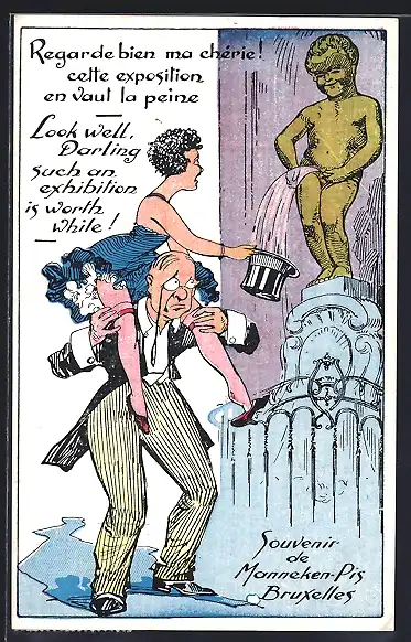 AK Bruxelles, Frau sitzt auf den Schultern ihres Geliebten und fängt mit einem Zylinder Wasser vom Manneken-Pis auf