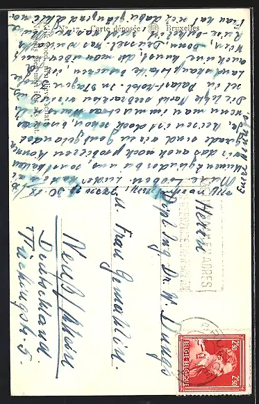 Personenbezogene Daten auf der Rückseite der Karte wurden durch blauen Textmarker unkenntlich gemacht. Die blauen Stellen sind auf die Vorderseite durchgeweicht und wirken sich negativ auf das Postkartenfoto aus