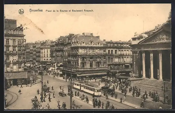 AK Bruxelles, Place de la Bourse et Boulevard Anspach, Strassenbahn