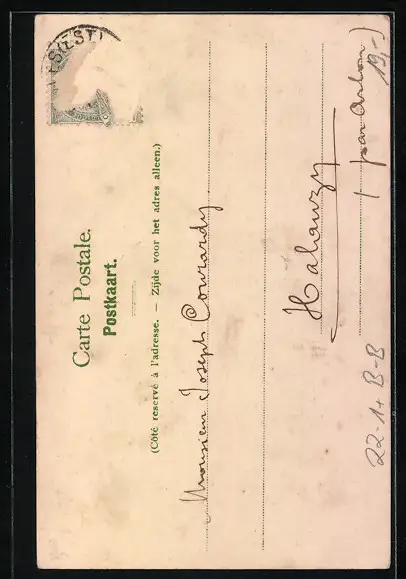 Personenbezogene Daten auf der Rückseite der Karte wurden durch blauen Textmarker unkenntlich gemacht. Die blauen Stellen sind auf die Vorderseite durchgeweicht und wirken sich negativ auf das Postkartenfoto aus