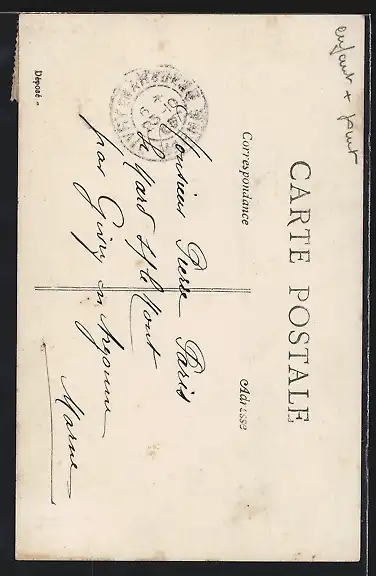 Personenbezogene Daten auf der Rückseite der Karte wurden durch blauen Textmarker unkenntlich gemacht. Die blauen Stellen sind auf die Vorderseite durchgeweicht und wirken sich negativ auf das Postkartenfoto aus