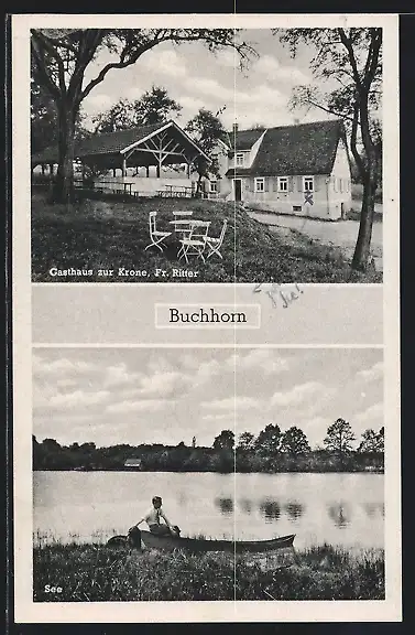 AK Buchhorn / See, Gasthaus zur Krone, Ruderboot am See