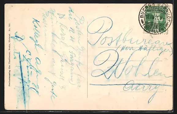 Personenbezogene Daten auf der Rückseite der Karte wurden durch blauen Textmarker unkenntlich gemacht. Die blauen Stellen sind auf die Vorderseite durchgeweicht und wirken sich negativ auf das Postkartenfoto aus