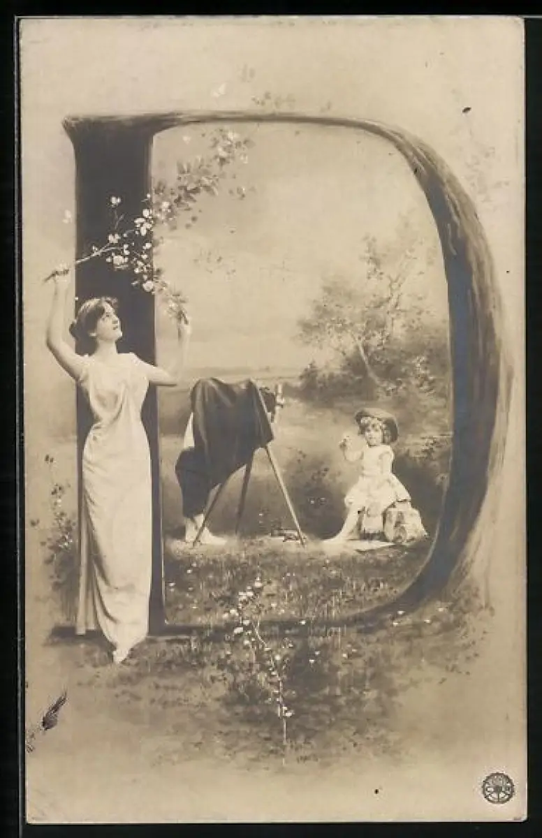 AK Buchstabe D, Mädchen sitzt vor einem Fotoapparat