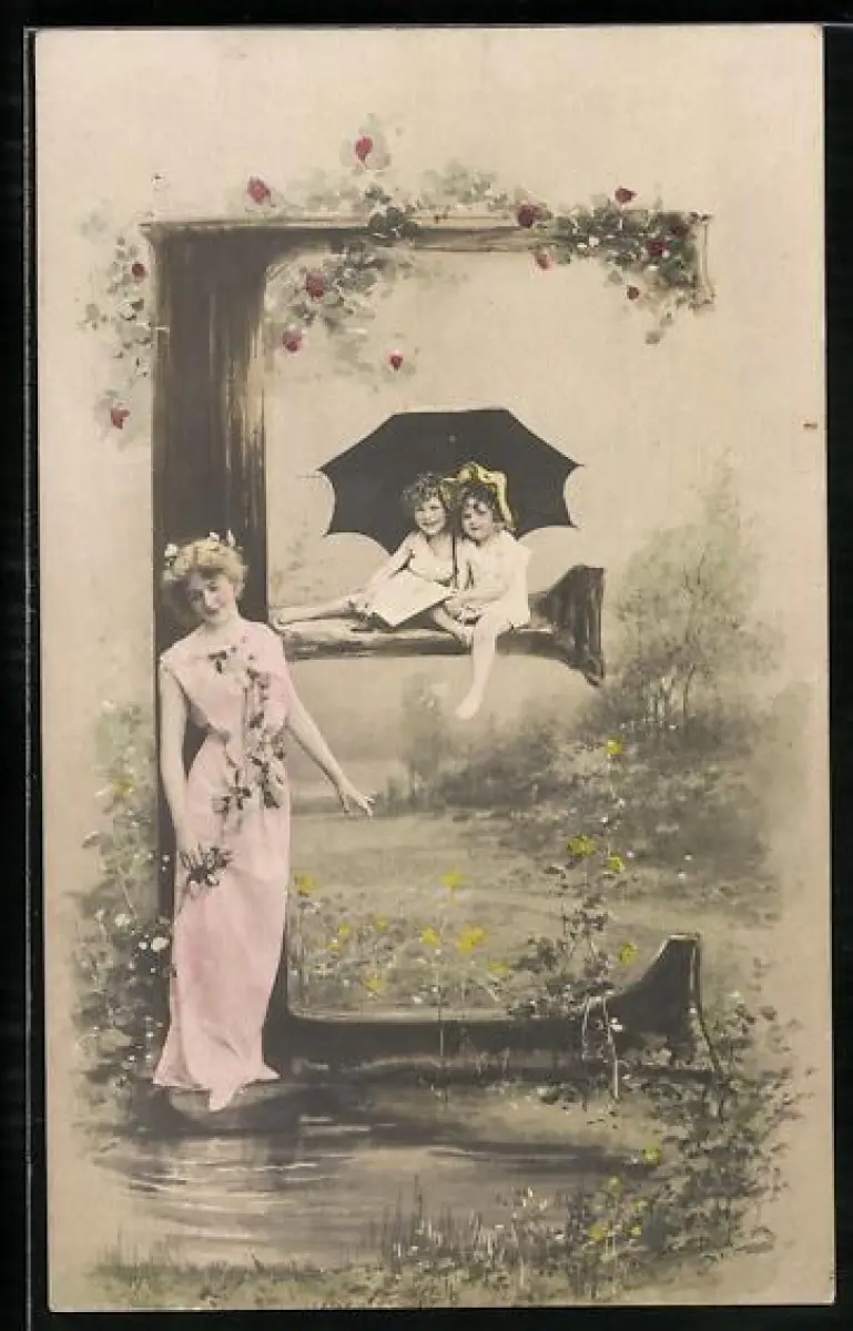 AK Buchstabe E, Junge Frau und zwei Mädchen unterm Schirm