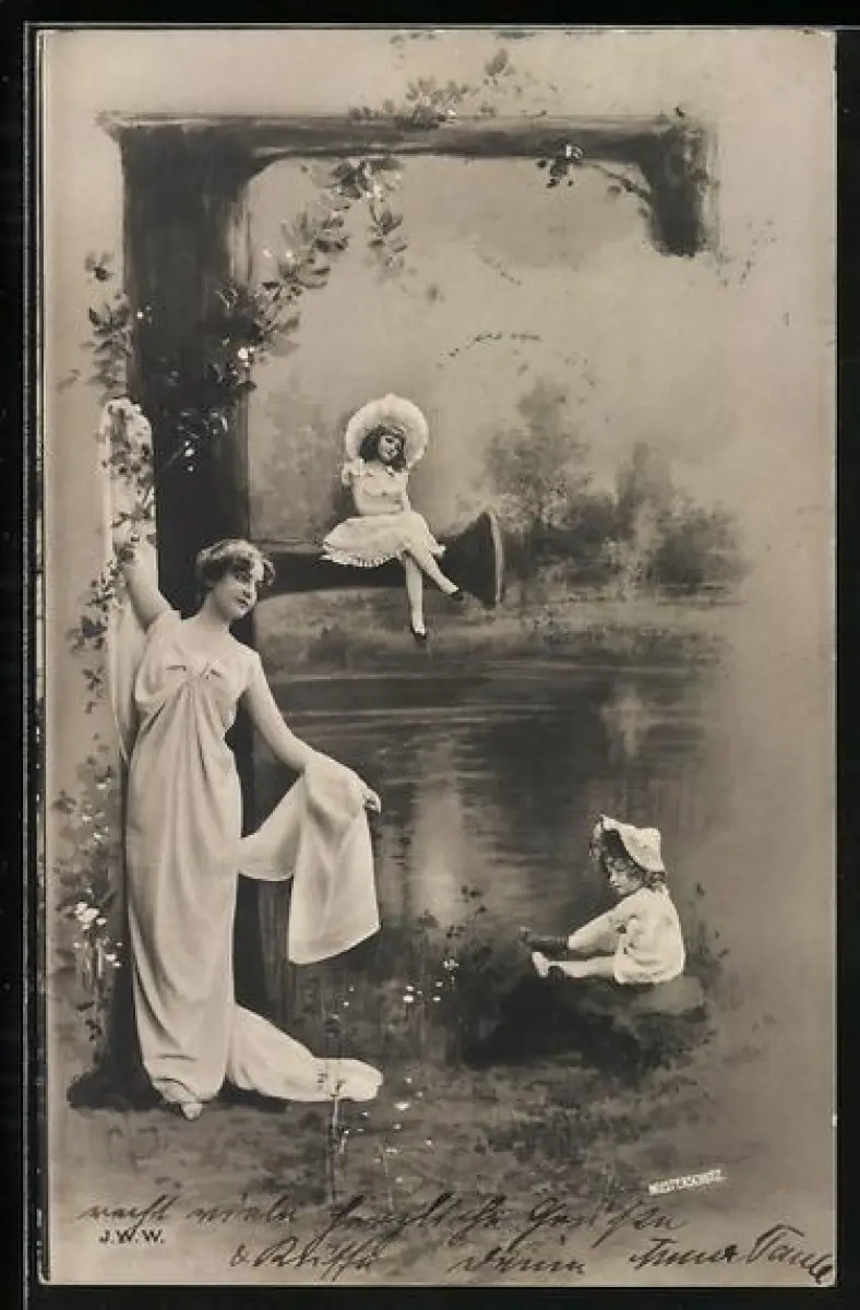 AK Buchstabe F, Frau und kleine Mädchen an einem See