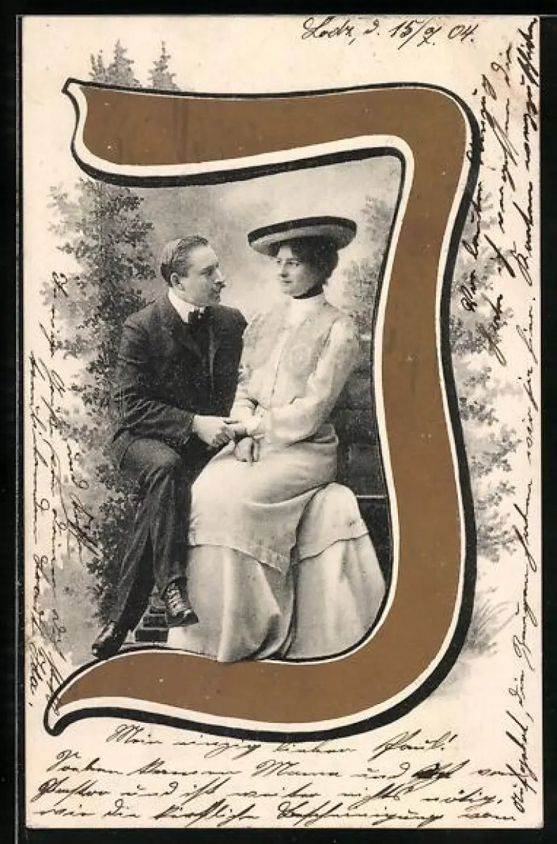 AK Buchstabe J, Verliebtes Paar sitzt verträumt auf einer Bank