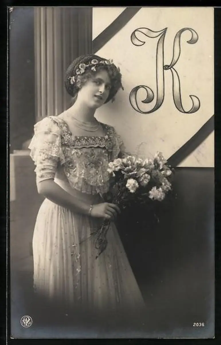 AK Buchstabe K an einer Leinwand, Frau im Kleid mit Blumenstrauss