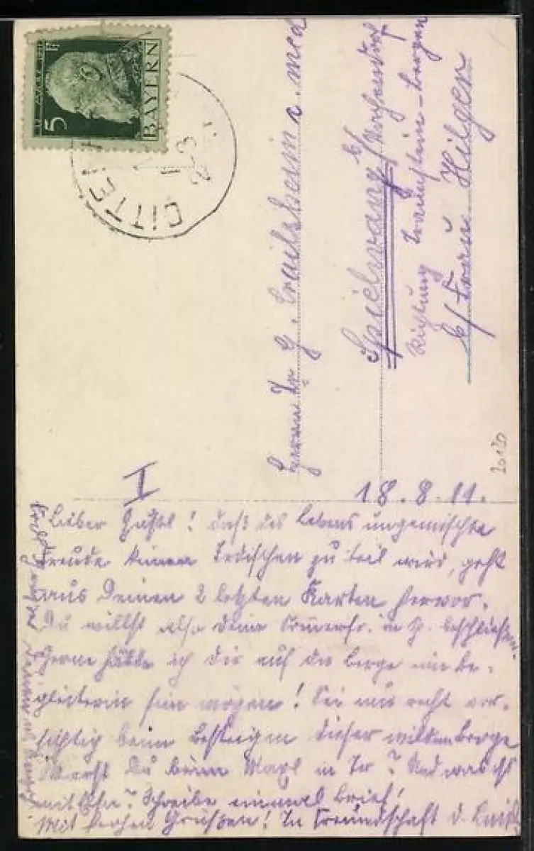 Personenbezogene Daten auf der Rückseite der Karte wurden durch blauen Textmarker unkenntlich gemacht. Die blauen Stellen sind auf die Vorderseite durchgeweicht und wirken sich negativ auf das Postkartenfoto aus