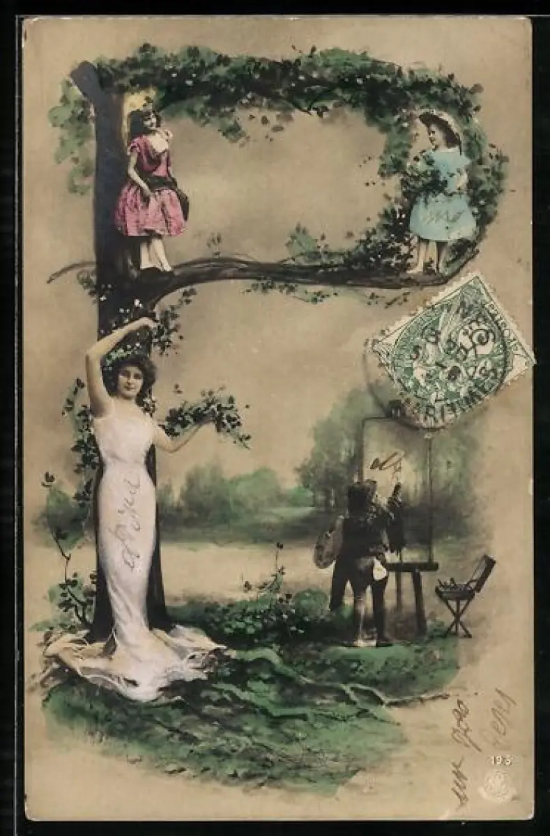 AK Buchstabe P, Maler steht an seiner Staffelei, Kinder stehen auf dem Buchstaben