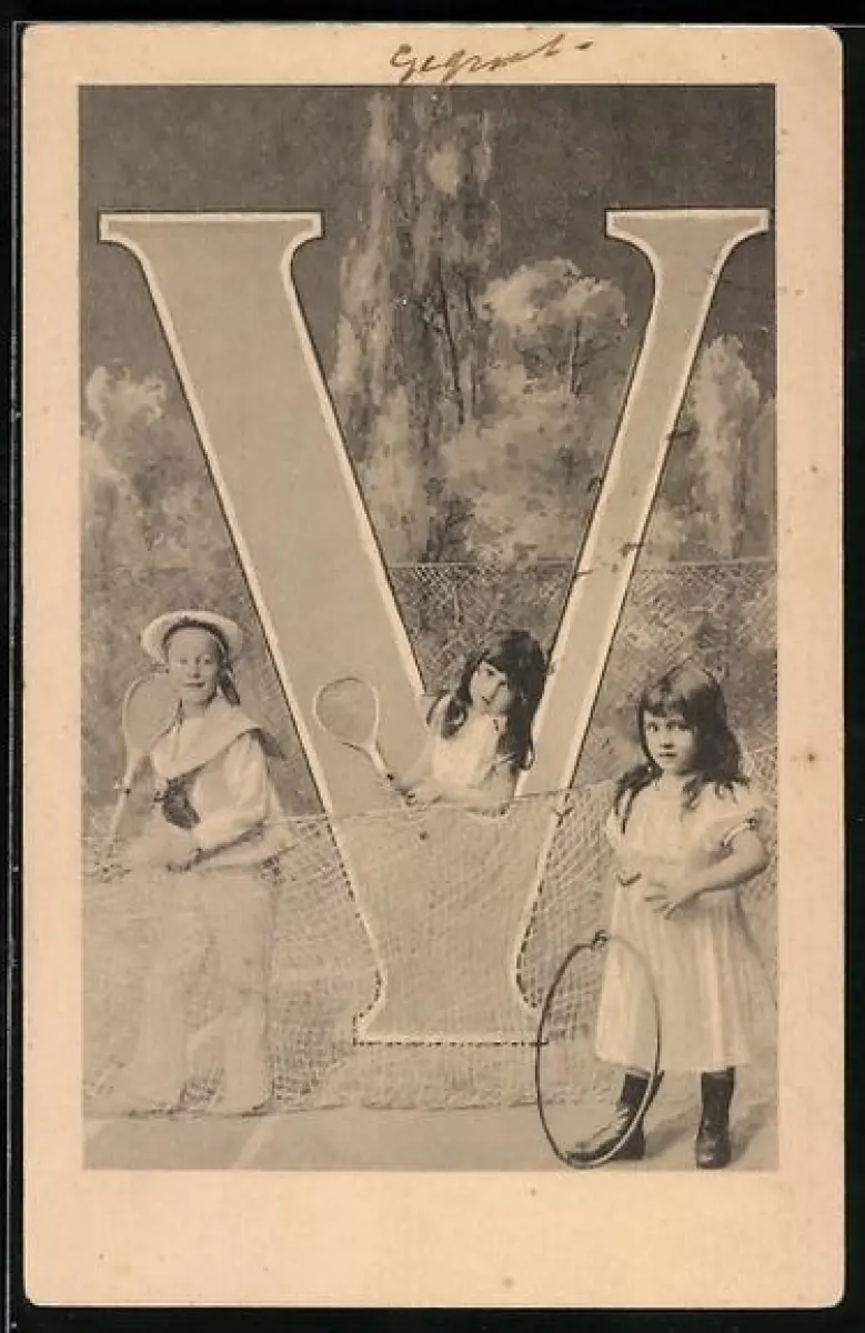 AK Buchstabe V, Kinder mit Tennisschlägern, Mädchen mit Reifen