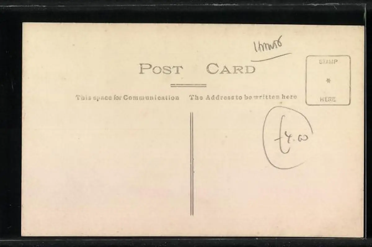 Personenbezogene Daten auf der Rückseite der Karte wurden durch blauen Textmarker unkenntlich gemacht. Die blauen Stellen sind auf die Vorderseite durchgeweicht und wirken sich negativ auf das Postkartenfoto aus