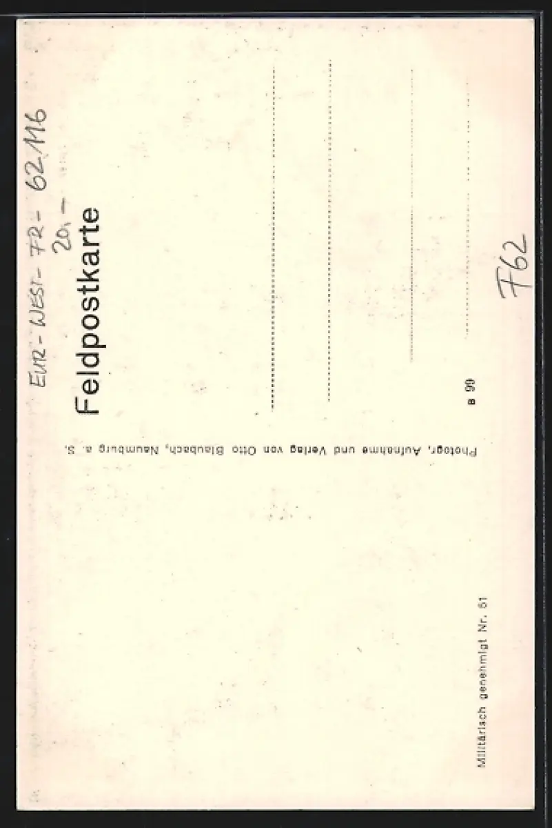 Personenbezogene Daten auf der Rückseite der Karte wurden durch blauen Textmarker unkenntlich gemacht. Die blauen Stellen sind auf die Vorderseite durchgeweicht und wirken sich negativ auf das Postkartenfoto aus
