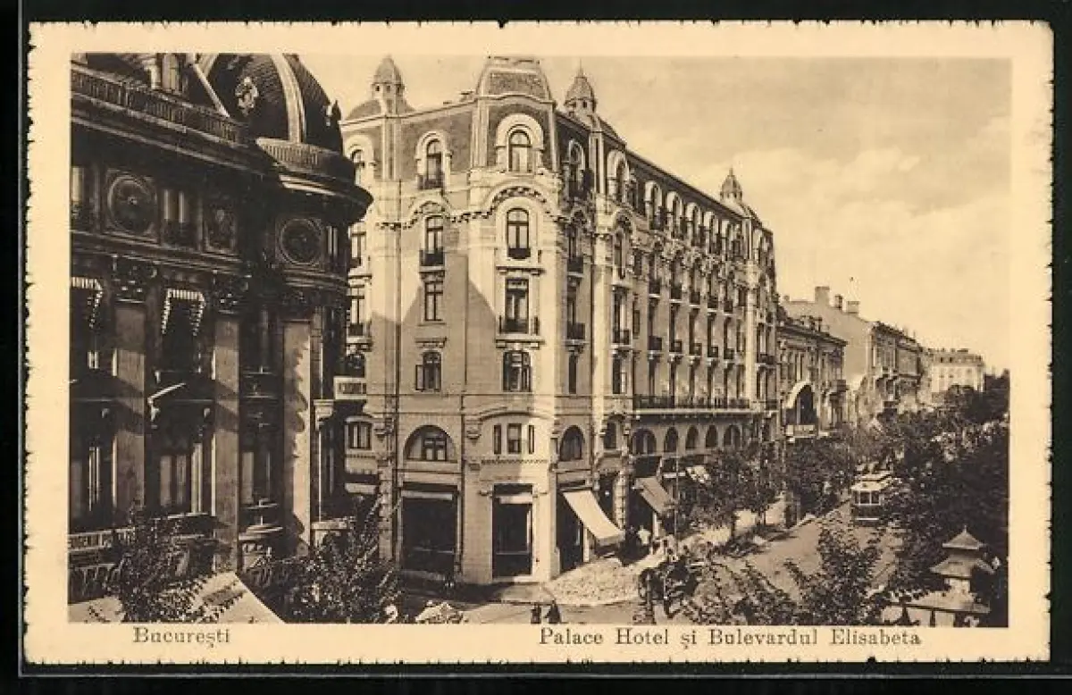 AK Bucuresti, Palace Hotel si Bulevardul Elisabeta, Strassenbahn