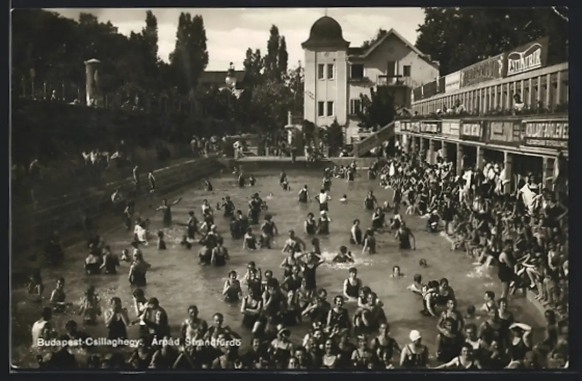 AK Budapest, Csillaghegver Strandbad aus der Vogelschau