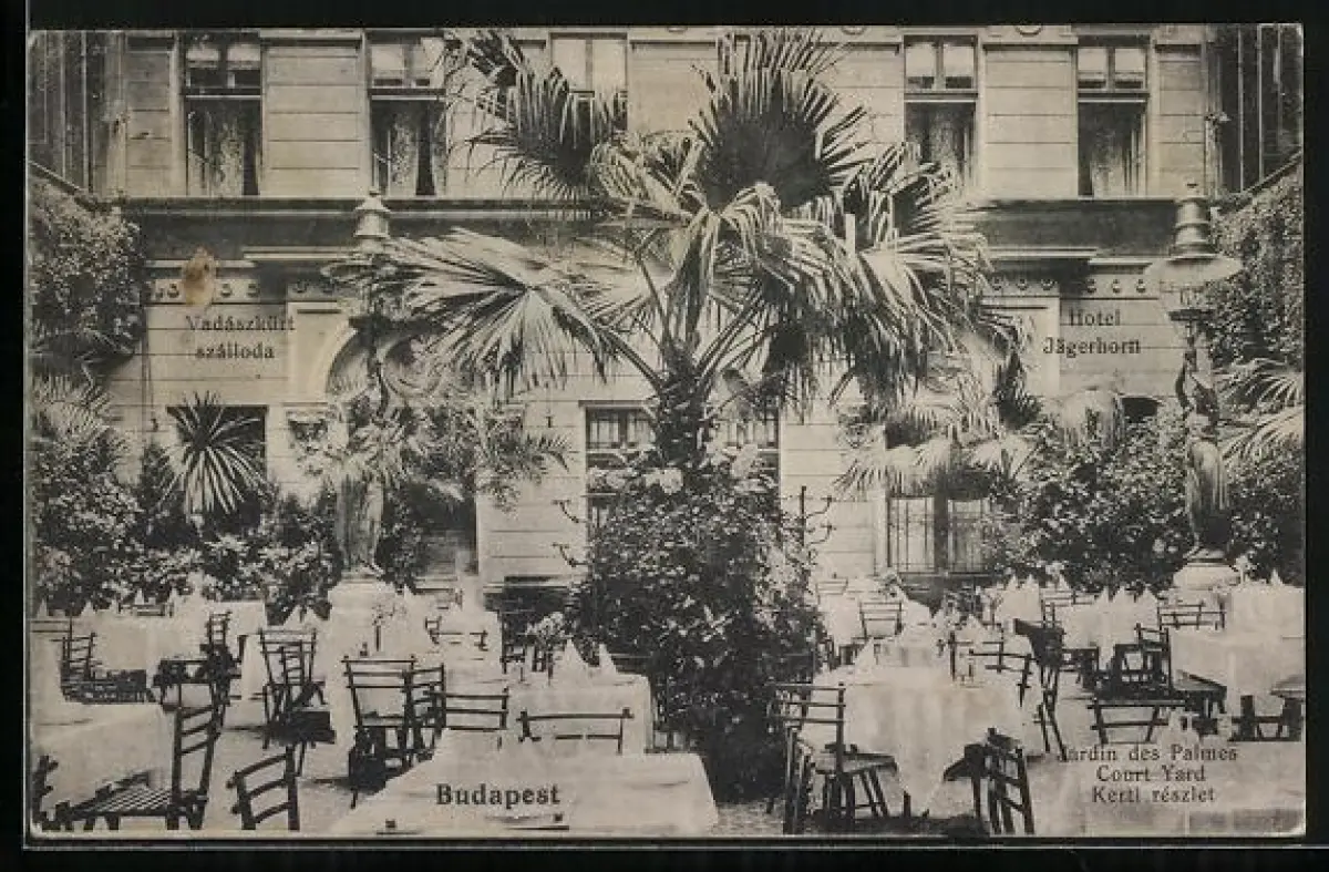 AK Budapest, Hotel Jägerhorn mit Gartenterrasse