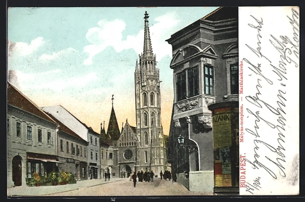 AK Budapest, Matthiaskirche mit Strasse
