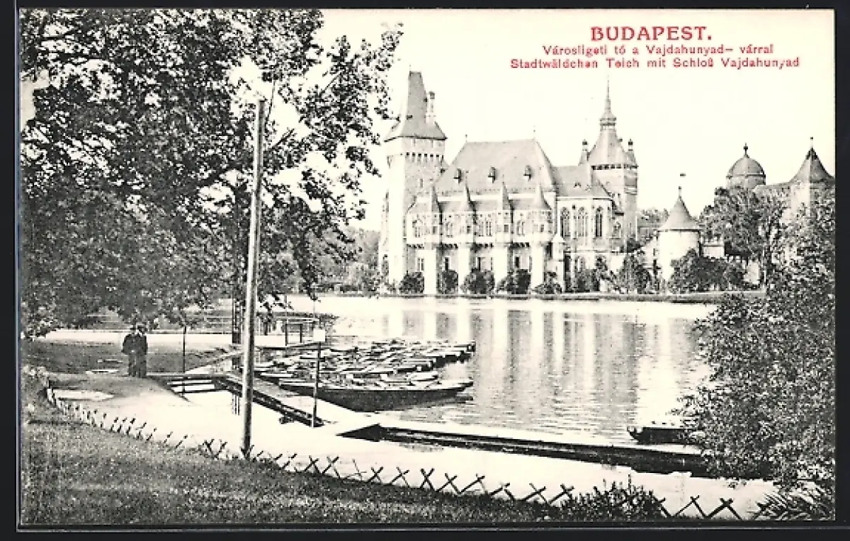 AK Budapest, Stadtwäldchen-Teich mit Schloss Vajdahunyad