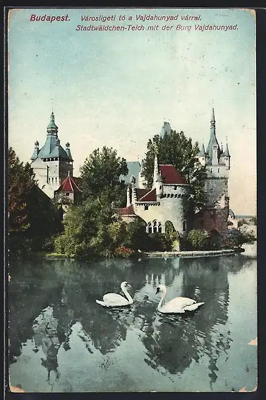 AK Budapest, Stadtwäldchen-Teich mit der Burg Vajdahunyad