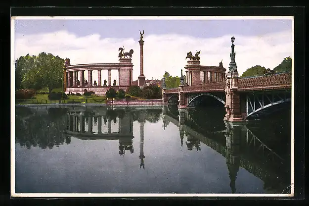 AK Budapest, Stadtwäldchenteich-Partie mit Milleniums-Denkmal