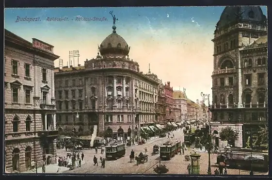AK Budapest, Strassenbahnen in der Rákóczi-Strasse, Rákóczi-út, Pferdekutsche