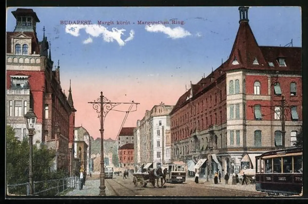 AK Budapest, Strassenpartie am Margarethenring, Strassenbahn