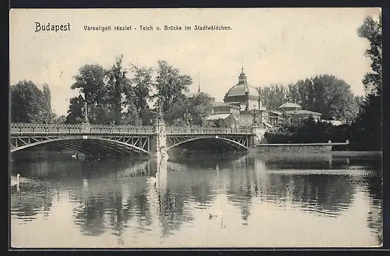 AK Budapest, Teich und Brücke im Stadtwäldchen, Városligeti részlet