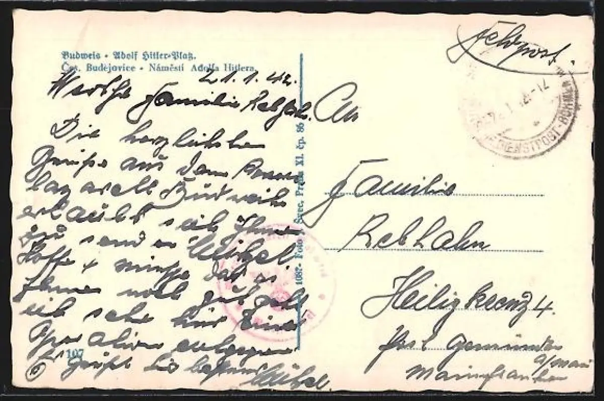 gelaufen 1942, Eckknicke re., minimaler Einriss re. mittig, guter Zustand