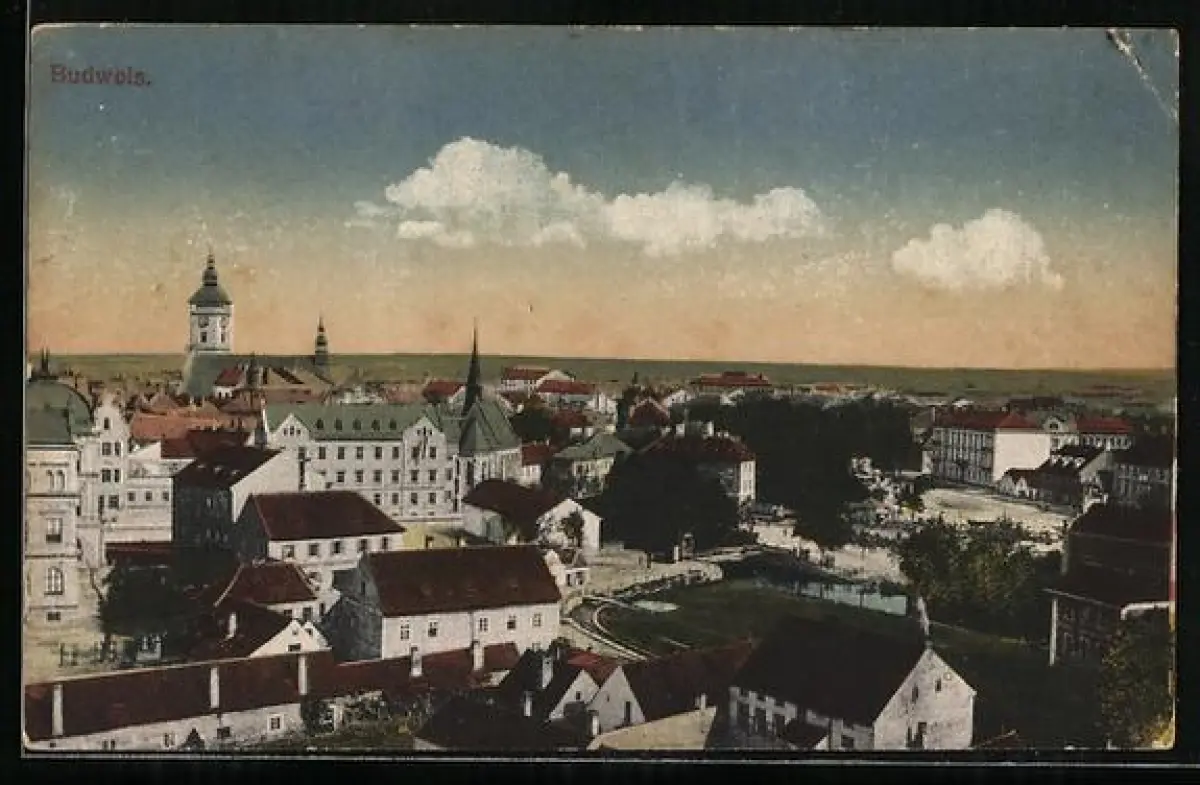 AK Budweis, Ortsansicht mit Kirche aus der Vogelschau